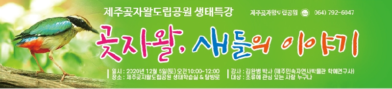 - 제주곶자왈도립공원 생태 특강 - 곶자왈은 팔색조, 긴꼬리딱새, 직박구리 등 다양한 새들이 저마다의 이야기를 쏟아내고 있는 장소랍니다. 다가오는 12월, 저희 곶자왈도립공원에서는 ‘곶자왈, 새들의 이야기’라는 주제로 생태특강의 자리를 마련합니다. 오랜 시간 새들과 함께 시간을 보내며 연구해 오신 김완병 박사(현, 민속자연사박물관 학예연구원)를 모시고 곶자왈의 새들에 대해 알아보고 그 새들의 이야기에 귀기울여보는 시간을 갖고자 합니다. 곶자왈 새들의 이야기에 귀를 기울이고 함께 지켜나가실 분들의 많은 관심과 참여 부탁드립니다.