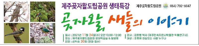 - 곶자왈, 새들의 이야기 (제주곶자왈도립공원 생태 특강) - 곶자왈은 팔색조, 긴꼬리딱새, 직박구리 등 다양한 새들이 저마다의 이야기를 쏟아내고 있는 장소랍니다. 다가오는 11월24일(수), 저희 곶자왈도립공원에서는 ‘곶자왈, 새들의 이야기’라는 주제로 생태특강의 자리를 마련합니다. 오랜 시간 새들과 함께 시간을 보내며 연구해 오신 김완병 박사(현, 민속자연사박물관 학예연구원)를 모시고 곶자왈의 새들에 대해 알아보고, 그 새들의 이야기에 귀기울여보는 시간을 갖고자 합니다. 곶자왈 새들의 이야기에 귀를 기울이고 함께 지켜나가실 분들의 많은 관심과 참여 부탁드립니다.
