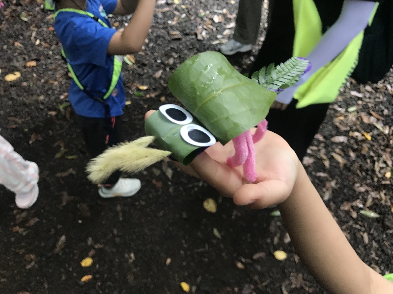 활동을 시작할 땐 빗방울이 떨어졌지만, 나뭇잎 곤충을 만든 후에는 비가 그쳐 곶자왈 숲속 이곳저곳에 숨겨보며 자연 속에서 놀이를 이어갔답니다.