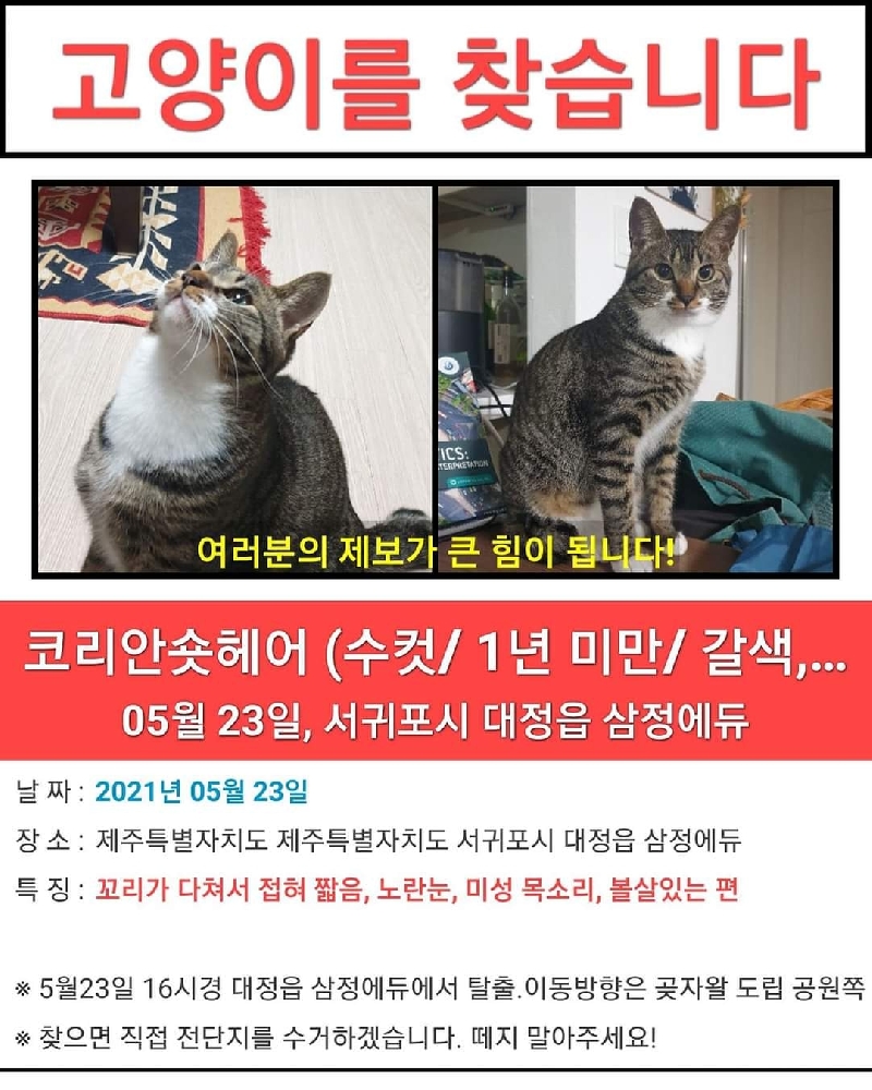 혹시 일하시는 직원분들께 고양이 사진 전달 드리실 수 있다면, 비슷한 고양이를 보신다면 연락을 부탁드립니다. 고양이 이름은 슈입니다. 슈라고 부르면 다가옵니다. 호기심이 많은 고양이라서 얼마나 멀리 갔을지 모르겠네요. 혹시나 하는 희망을 가지고 Q&A에 글을 남깁니다. 감사합니다. |