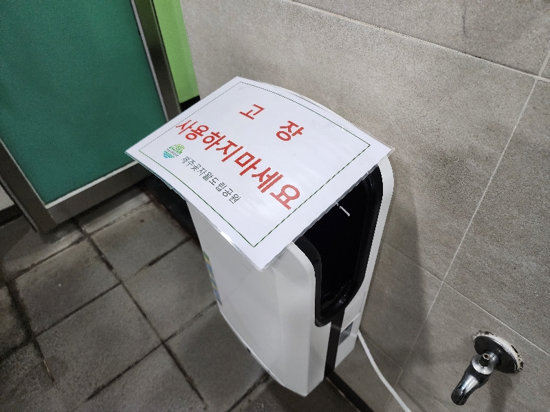 화장실을 이용하고 손을 말리려고 보니 사진처럼 핸드드라이어가 고장이라고 사용하지 말라고 떡하니 붙여놨네요. 고장이나서 사용하지도 못할텐데... 고장이 났으면 임시로 사용할 핸드타올이라도 비치했으면 좋으련만... 앞에 글도 보면 개인관광지보다 못하게 관리되고 있던데 도립공원이 맞는지요? 평소에도 화장실이 냄새도 많이나고 바닥에는 늘 축축해 있던데 관리직원이 따로 없나 봅니다 |