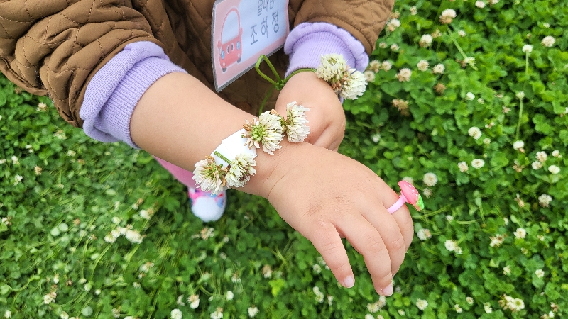 새벽에 비가 그쳐 대정어린이집 친구들을 만날 수 있던 날! 생태학교 운동장 가득 피어있는 토끼풀을 보며 왕관,목걸이,부케 만들기에 여념없던 친구들^^ 학습 강의실에서 인사하고 수수께끼 주머니로 로제트에 대해 궁금점을 갖게 한 후 로제트 제기차기, 보자기 게임 등을 하며 로제트와 인사 하던 날^^ |