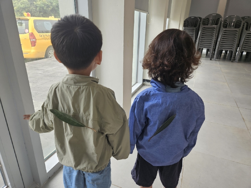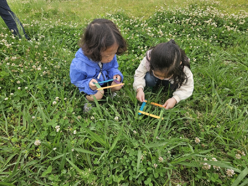 숲속에서 모양이 그려진 종이를 들고, 똑같은 모양의 자연물을 찾는 보물찾기 놀이를 함께 했어요. 작은 들꽃 하나, 나뭇잎 하나도 유심히 살펴보았습니다. 또 '내 나뭇잎은 어떻게 생겼니?'놀이도 했어요. 서로의 등에 붙은 나뭇잎의 모양을 설명해주고, 같은 모양의 나뭇잎을 찾는 활동이었어요. 서로 묻고 답하며, 자연스럽게 소통하는 아이들의 모습이 인상적이었어요.